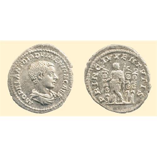 AR Denarius (2.74 g). M OPEL ANT DIADVMENIAN CAES, draped bust of Diadumenian right / PRINC IVVENTVTIS, Diadumenian standing left, head right, among military standards. C.3; RIC 102; BMC 87.