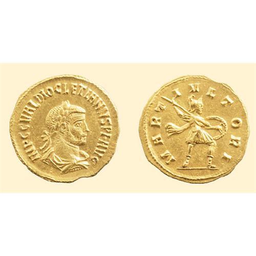 AV Aureus (4.62 g). Cyzicus, 284-286 AD. IMP CC VAL DIOCLETIANVS PF AVG, laureate, draped and cuirassed bust right / MARTI VLTORI, Mars Ultor advancing right, holding shield and raising spear. RIC V/II 300; Depeyrot 2/4.