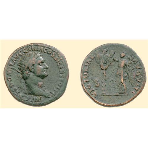 AE As (12.21 g), 85 AD. IMP CAES DOMIT AVG GERM COS XI CENS POT P P, laureate head of Domitian right / VICTORIA - AVGVSTI / S-C, Victory writing on a trophy. C. 640; RIC 296.
