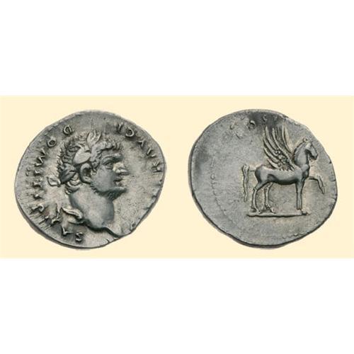 AR Denarius (3.54 g). 76 AD. DOMITIANVS CAESAR AVG F, laureate head of Domitian right / COS IIII, Pegasus right. C. 47; RIC 42, 238.