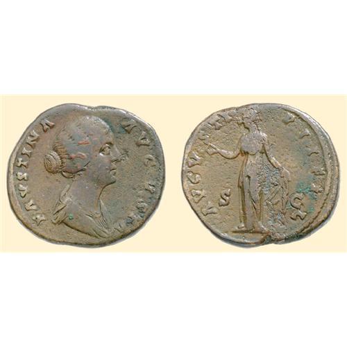 AE Sestertius (24.55 g). Before 161 AD. FAVSTINA - AVGVSTA, draped bust of Faustina Junor right/ AVGVSTI - PII FIL / S-C, Spes standing left, holding a flower. C. 25; RIC 1371.