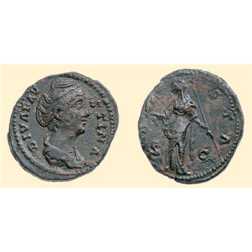 AE As (12.25 g). After 141 AD. DIVA - FAVSTINA, diademed and draped bust of Faustina Senior right / AVGV-STA / S-C, Vesta standing left, holding palladium and scepter. C. 111; RIC 1179.