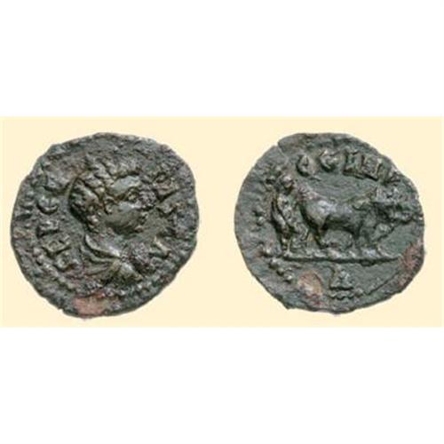 AE 15 (1.70 g) Parion, Mysia. SEP GE-TAS KAI, draped bust of Geta right / C G I H /PA, city founder driving chariot pulled by bulls right. C. 785; SNG von Aulock 1341.
