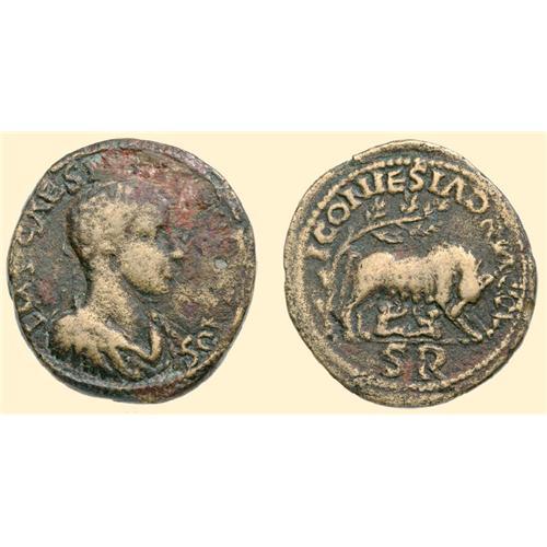 AE Sestertius (28.07 g). Iconium, Lycaonia. IMP CAES [M AN GORDIA]NOS, laureate draped bust of Gordian III right / ICONIENSI ADRIA COL / SR, she-wolf giving milk to Romulus and Remus. SNG von Aulock (Lykaonia) -, but cf. 333.