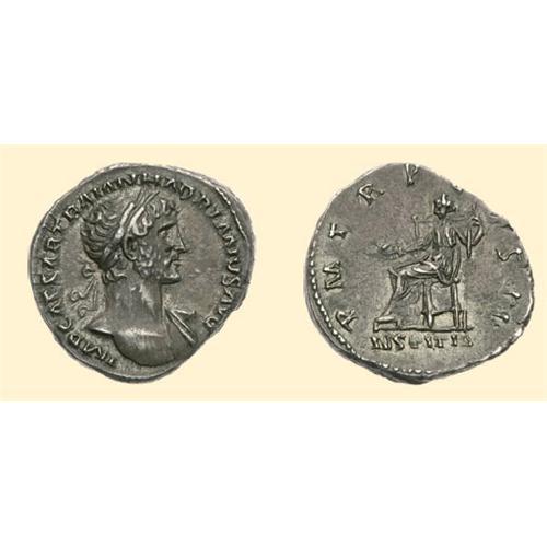 AR Denarius (3.67 g). 118 AD. IMP CAESAR TRAIAN HADRIANVS AVG, bust of Hadrian right, with cape on the shoulder / P M TR P COS II / IVSTITIA, Iustitia seated left. C. 877; RIC 345, 42.