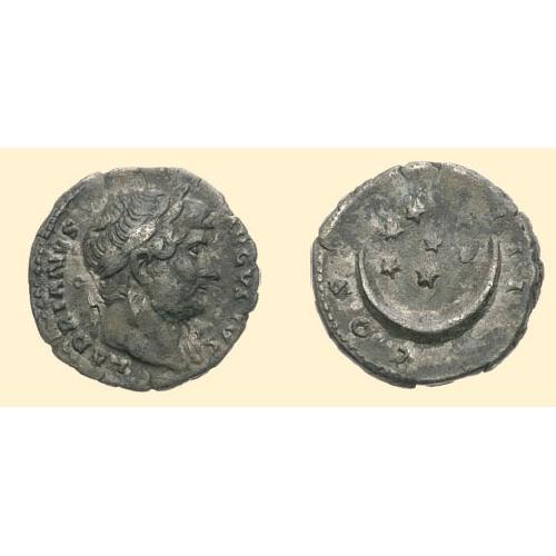 AR Denarius (2.79 g). 125-128 AD. HADRIANVS AVGVSTVS, head of Hadrian right / COS III, lunar crescent and seven stars. C. 60; RIC 362, 200.