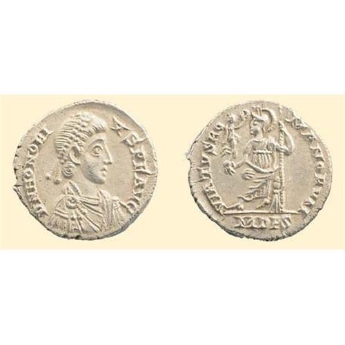 AR Siliqua (2.24 g). Mediolanum (Milan). DN HONORI-VS PF AVG, diademed, draped and cuirassed bust of Honorius right / VIRTVS RO-MANORVM / MDPS, Roma enthroned left, holding Victory. RIC 32c.