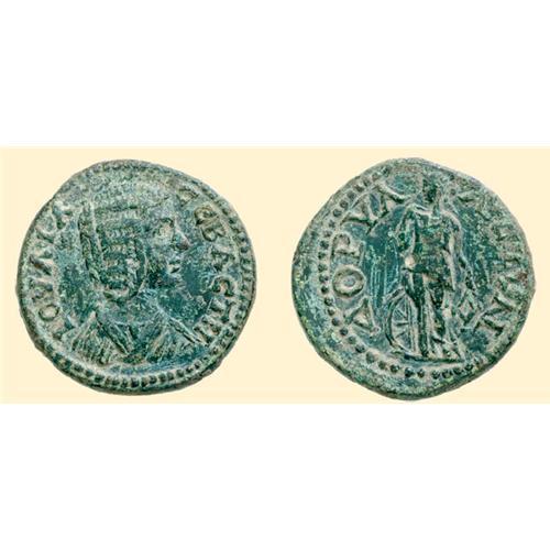 AE 25 (9.71 g). Dorylaion, Phrygia. <SPAN STYLE=`FONT-SIZE:10.0PT;FONT-FAMILY:SYMBOL;COLOR:#333333`>IOULIA - </SPAN>C<SPAN STYLE=`FONT-SIZE:10.0PT;FONT-FAMILY:SYMBOL;COLOR:#333333`>EBA</SPAN>C<SPAN STYLE=`FONT-SIZE:10.0PT;FONT-FAMILY:SYMBOL;COLOR:#333333`>TH</SPAN>, draped bust of Julia Domna right / <SPAN STYLE=`FONT-SIZE:10.0PT;FONT-FAMILY:SYMBOL;COLOR:#333333`>DORULAEWN</SPAN>, Nemesis standing left. SNG von Aulock (Phrygia II), 226; SNG von Aulock 3560.