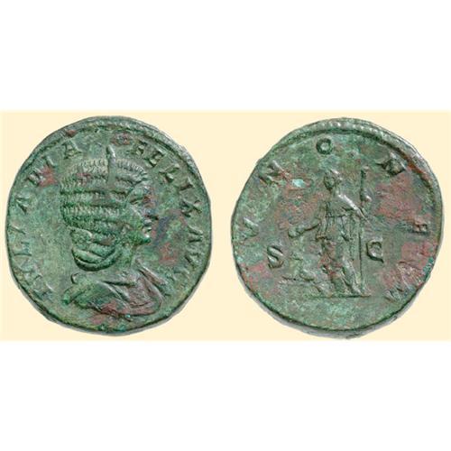 Struck under Caracalla. AE Sestertius (28.64 g), 211-217 AD. IVLIA PIA - FELIX AVG, diademed draped bust of Julia Domna right / IVNONEM / S - C, Juno, veiled, standing left, holding scepter and patera, peacock at her feet. C. 90; RIC 310, 585.