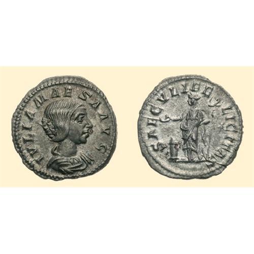 AR Denarius (2.98 g). IVLIA MAESA AVG, draped bust of Julia Maesa right / SAECVLI FELICITAS, Felicitas standing left, before a lit altar, star in right field. C. 45; RIC 50, 272.
