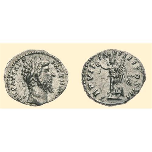 AR Denarius (3.20 g). 166-167 AD. L VERVS AVG GERM - PARTH MAX, laureate head of Lucius Verus right / TR P VII - IMP IIII COS III, Victory striding left. C. 295; RIC 260, 574.