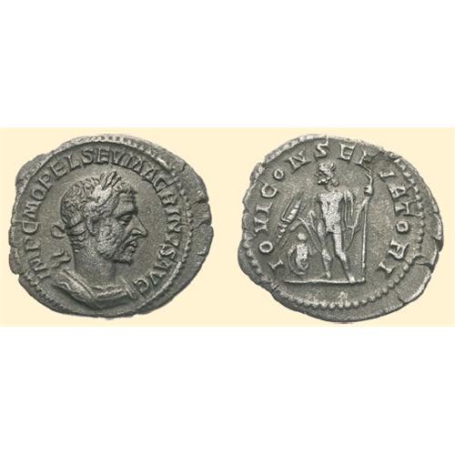 AR Denarius (2.90 g). 217 AD. IMP C M OPEL SEV MACRINVS AVG, laureate and cuirassed bust of Macrinus right / IOVI CONSERVATORI, Jupiter standing left, Macrinus before him. C. 37; RIC 10, 76.