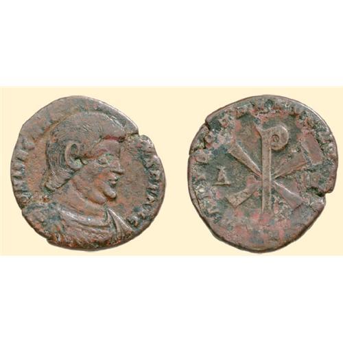 AE Centenionalis (6.27 g). Trier, 352 AD. D N MAGNEN-TIVS AVG, draped bust of Magnentius right / SALVS DD ET CAESS, large Christogram. RIC 318; Bastien 84.