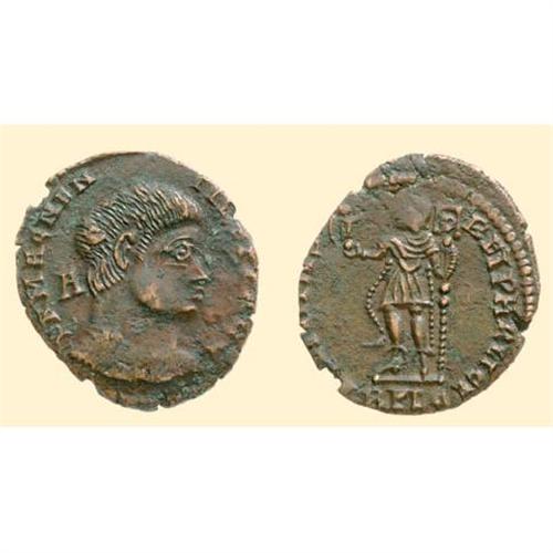 AE Centenionalis (2.49 g). Lyon. D N MAGNEN-TIVS P F AVG, head of Magnentius to right, A behind / FELICITAS - REIPVBLICE / FPLG, emperor left, holding a Victory and a labarum. RIC 109 var. Bastien -. An ancient imitation.