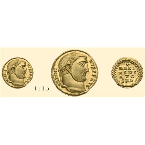 Aureus (5.28 g). Antioch, 310-311 AD. MAXIMI-NVS P F AVG, laureate head right / X / MAXI/ MINI / AVG / SMA, all within wreath. C. 222; RIC 635, 131.
