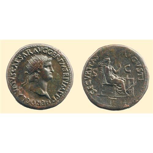 AE Dupondius (15.24 g). 62-68 AD. NERO CLAVDIVS CAESAR AVG GER P M TR P IMP P P, radiate head of Nero right / SECVRITAS AVGVST / S-C, Securitas enthroned left. RIC 193.