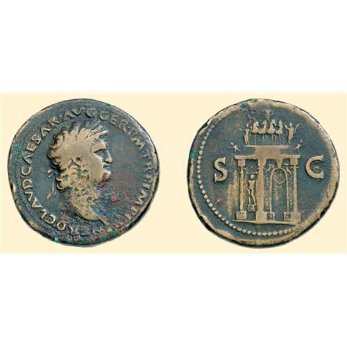 AE Sestertius (25.70 g). Lyon, 64-67 AD. NERO CLAVD CAESAR AVG GER P M TR P IMP P P, laureate head of Nero right / S-C, triumphal arch with quadriga. C. 307; RIC 432.