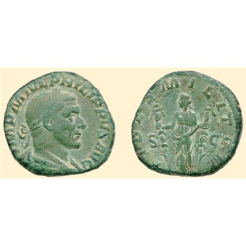 AE Sestertius (13.30 g). IMP M IVL PHILIPPVS AVG, laureate draped bust of Philip I right / FIDES MILITVM / S-C, Fides standing left, holding two standards. La C. 59; RIC 172 a.