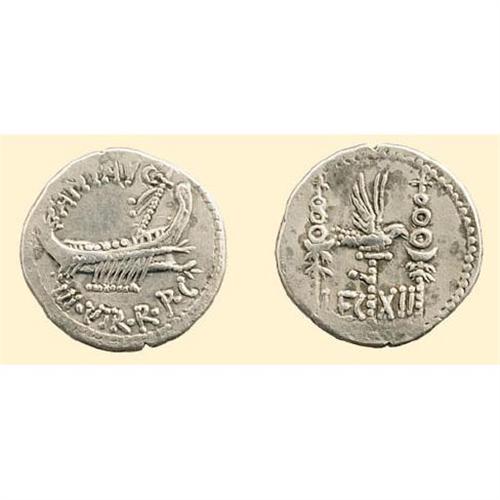 Mark Antony. 32-31 BC. AR Legionary Denarius (3.78 g). 32-31 B.C. ANT AVG III VIR R P C, galley right / LEG XII, aquila between two standards. Cr. 544/26.