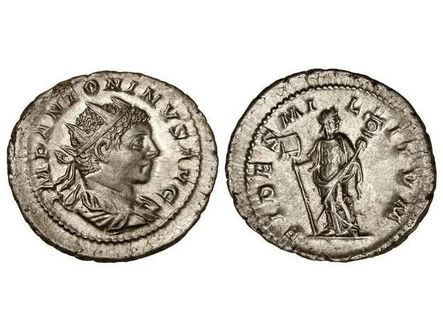 ROMAN COINS: ROMAN EMPIRE - Antoniniano. Acuñada el 222 d.C. HELIOGÁBALO. Anv.: IMP. ANTONINVS AVG. Busto radiado a derecha. Rev.: FIDES MILITVM. Fe en pie de frente. AR. C-39. EBC.