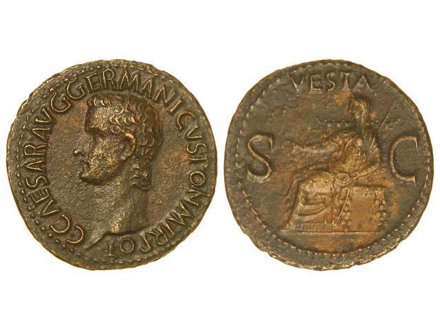 ROMAN COINS: ROMAN EMPIRE - As. Acuñada el 37 d.C. CALÍGULA. Anv.: C. CAESAR AVG. GERMANICVS PON. M. TR. POT. Cabeza descubierta a izquierda. Rev.: VESTA S. C. Vesta sentada a izquierda con cetro y pátera. C-27. MBC+.