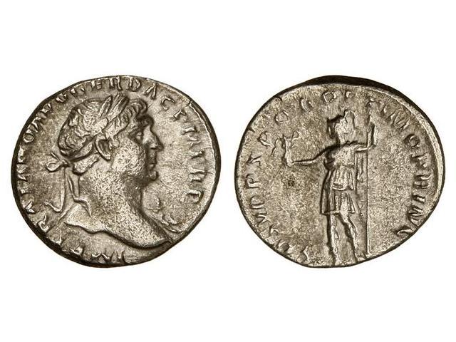 ROMAN COINS: ROMAN EMPIRE - Denario. Acuñada el 103-112 d.C. TRAJANO. Anv.: IMP. TRAIANO AVG. GER. DAC. P. M. TR. P. Busto laureado a derecha. Rev.: COS. V P. P. S. P. Q. R. OPTIMO PRINC. Roma de pie con lanza y Victoria. C-68a. MBC.