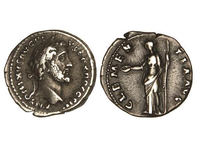 ROMAN COINS: ROMAN EMPIRE - Denario. Acuñada el 140-143 d.C. ANTONINO PÍO. Anv.: ANTONINVS AVG. PIVS P. P. TR. P. COS. III. Cabeza laureada a derecha. Rev.: CLEMENTIA AVG. Clemencia en pie a izquierda. C-124. MBC+/MBC.