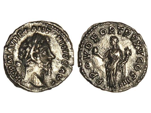 ROMAN COINS: ROMAN EMPIRE - Denario. Acuñada el 160-161 d.C. MARCO AURELIO. Anv.: IMP. M. AVREL. ANTONINVS AVG. Cabeza laureada a derecha. Rev.: PROV. DEOR. TR. P. XV COS. III. Providencia en pie a izquierda. C-508. MBC+.