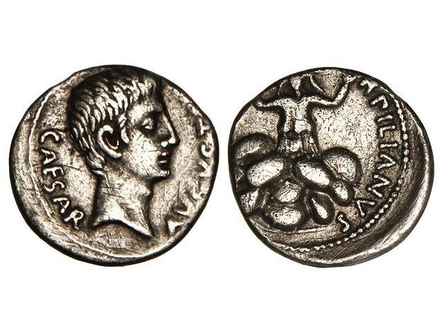 ROMAN COINS: ROMAN EMPIRE - Denario. Acuñada el 18 a.C. AUGUSTO. Anv.: CAESAR AVGVST(VS). Cabeza descubierta a derecha. Rev.: (T)VRPILIANVS. (III VIR.). Tarpeia de frente levantando los brazos sobre un montón de escudos. (Rayitas en anverso, descentrada en reverso). C-494; Cal-1089; FFC-317. MBC+/MBC.