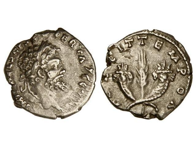 ROMAN COINS: ROMAN EMPIRE - Denario. Acuñada el 194 d.C. SEPTIMIO SEVERO. Anv.: IMP. CAE. L. (SEP. SEV.) PERT. AVG. COS. II. Cabeza laureada a derecha. Rev.: (FELI)CIT. TEMPOR. Espiga entre dos cornucopias cruzadas. C-142b. MBC+.