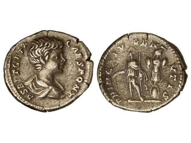 ROMAN COINS: ROMAN EMPIRE - Denario. Acuñada el 199-202 d.C. GETA. Anv.: P. SEPT. GETA CAES. PONT. Busto a derecha. Rev.: PRINC. IVVENTVTIS. Geta, de pie con atuendo militar con lanza invertida, detrás trofeo. (Pequeñas oxidaciones). C-157. MBC+.