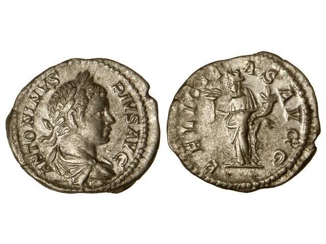 ROMAN COINS: ROMAN EMPIRE - Denario. Acuñada el 201-210 d.C. CARACALLA. Anv.: ANTONINVS PIVS AVG. Busto laureado a derecha. Rev.: FELICITAS AVGG. Felicidad, de pie con caduceo y cornucopia. C-64. EBC-/MBC+.