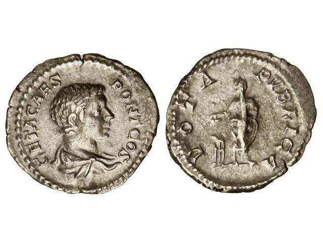 ROMAN COINS: ROMAN EMPIRE - Denario. Acuñada el 203-208 d.C. GETA. Anv.: GETA CAES. PONT. COS. Busto a derecha. Rev.: VOTA PVBLICA. Geta en pie, ceremoniando sobre altar en forma de trípode. C-230. EBC-/MBC+.