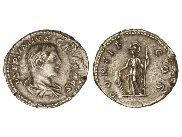 ROMAN COINS: ROMAN EMPIRE - Denario. Acuñada el 203-208 d.C. GETA. Anv.: P. SEPTIMIVS GETA CAES. Busto a derecha. Rev.: PONTIF. COS. Minerva a izquierda con lanza, reposando en escudo. C-104. MBC+.