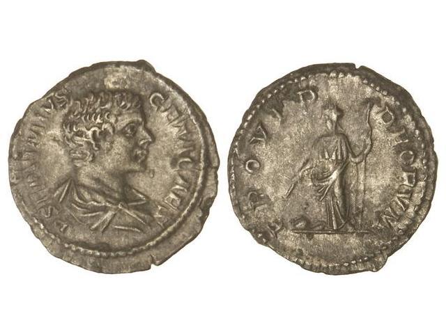 ROMAN COINS: ROMAN EMPIRE - Denario. Acuñada el 203-209 d.C. GETA. Anv.: P. SEPTIIVS GETA CAES. Busto a derecha. Rev.: PROVID. DEORVM. Providencia a izquierda, a sus pies globo. C-170. EBC-/MBC+.