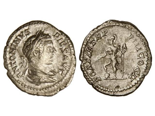 ROMAN COINS: ROMAN EMPIRE - Denario. Acuñada el 205 d.C. CARACALLA. Anv.: ANTONINVS PIVS AVG. Busto laureado a derecha. Rev.: PONTIF. TR. P. VIII COS. II. Marte estante, con lanza invertida y rama, pie encima de casco. C-420a. MBC+/MBC.