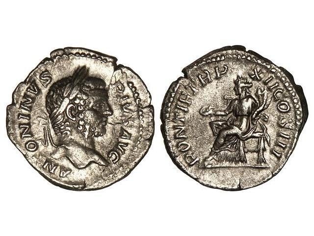 ROMAN COINS: ROMAN EMPIRE - Denario. Acuñada el 209 d.C. CARACALLA. Anv.: ANTONINVS PIVS AVG. Busto laureado a derecha. Rev.: PONTIF. TR. P. XII COS. III. Concordia sentada a izquierda. C-465. MBC+.