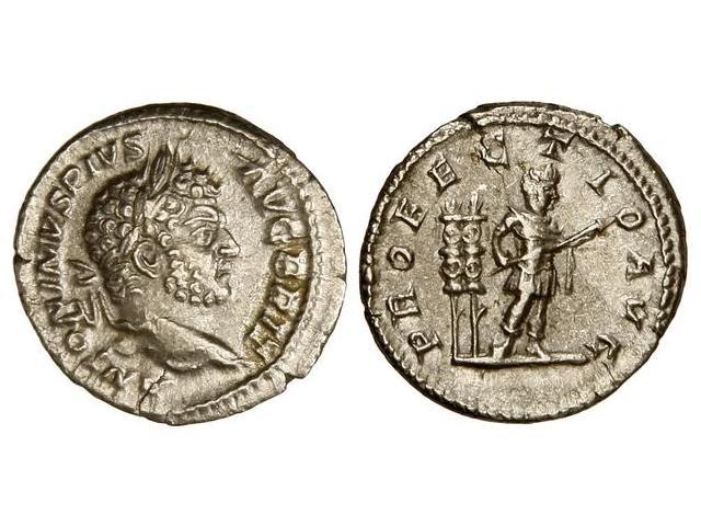 ROMAN COINS: ROMAN EMPIRE - Denario. Acuñada el 210-213 d.C. CARACALLA. Anv.: ANTONINVS PIVS AVG. BRIT. Cabeza laureada a derecha. Rev.: PROFECTIO AVG. Caracalla, de pie, con lanza a izquierda, dos estandartes. C-508. EBC.