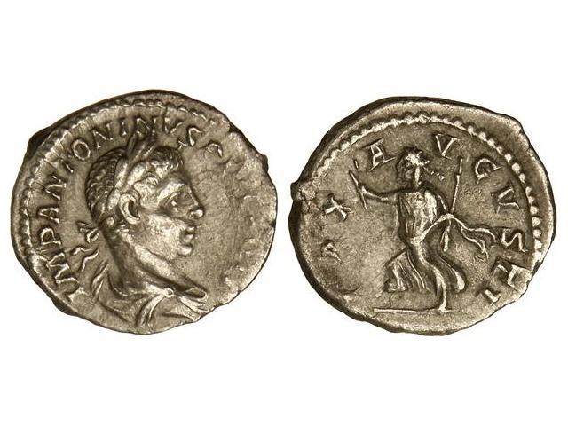 ROMAN COINS: ROMAN EMPIRE - Denario. Acuñada el 218 a 222 d.C. HELIOGÁBALO. Anv.: IMP. ANTONINVS PIVS AVG. Busto laureado a derecha. Rev.: PAX AVGVSTI. Paz en marcha a izquierda. C-120. EBC-.