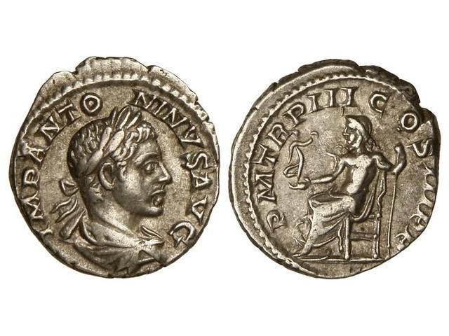 ROMAN COINS: ROMAN EMPIRE - Denario. Acuñada el 220 d.C. HELIOGABALO. Anv.: IMP. ANTONINVS AVG. Busto laureado a derecha. Rev.: P. M. TR. P. IIII COS. III P. P. Júpiter sedente a izquierda, portando cetro y Victoria, a sus pies águila. C-151. EBC-/MBC+.