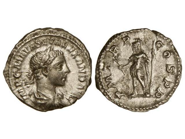 ROMAN COINS: ROMAN EMPIRE - Denario. Acuñada el 222 d.C. ALEJANDRO SEVERO. Anv.: IMP. C. M. AVR. SEV. ALEXAND. AVG. Busto laureado a derecha. Rev.: P. M. TR. P. COS. P. P. Marte, de pie con rama de olivo y lanza invertida. EBC/EBC-.