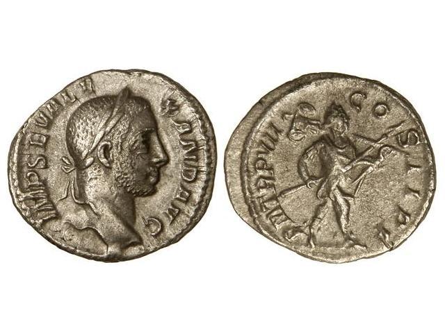 ROMAN COINS: ROMAN EMPIRE - Denario. Acuñada el 228 d.C. ALEJANDRO SEVERO. Anv.: IMP. SEV. ALEXAND. AVG. Busto laureado a derecha. Rev.: P. M. TR. P. VII COS. II P. P. Rómulo en marcha a derecha, portando lanza y trofeo. C-351. EBC-.