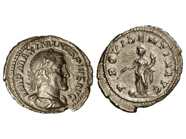 ROMAN COINS: ROMAN EMPIRE - Denario. Acuñada el 235-238 d.C. MAXIMINO I. Anv.: IMP. MAXIMINVS PIVS AVG. Busto laureado a derecha. Rev.: PROVIDENTIA AVG. Providencia, de pie con rama y cornucopia. En sus pies globo. C-77a. EBC-/MBC+.