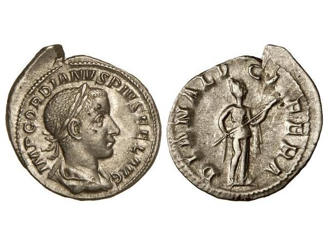 ROMAN COINS: ROMAN EMPIRE - Denario. Acuñada el 241 d.C. GORDIANO III. Anv.: IMP. GORDIANVS PIVS FEL. AVG. Busto laureado a derecha. Rev.: DIANA LVCIFERA. Diana de pie a derecha, portando antorcha. (Cospel irregular). C-69. EBC-/MBC+.