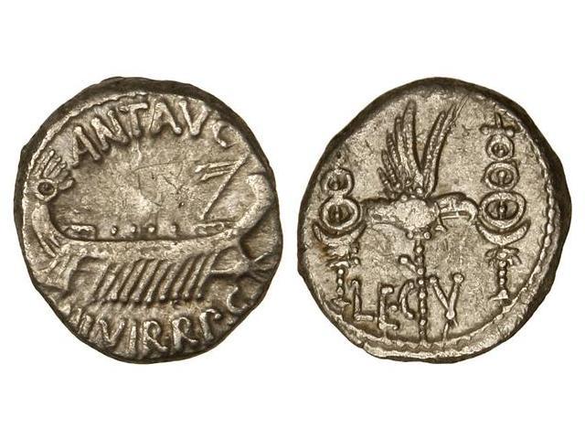 ROMAN COINS: ROMAN EMPIRE - Denario. Acuñada el 32-31 a.C. MARCO ANTONIO. Anv.: ANT. AVG. III VIR. R. P. C. Galera pretoriana a derecha. Rev.: Águila legionaria entre dos insignias militares LEG. V. (Pequeño grafiti en anverso). C-32; Cal-183; FFC-36. (EBC