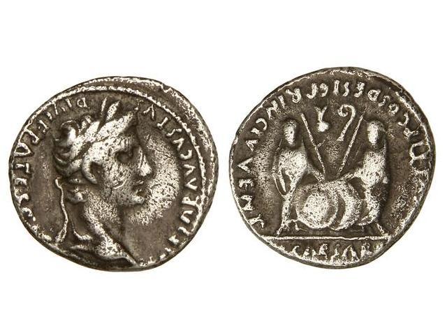 ROMAN COINS: ROMAN EMPIRE - Denario. Acuñada el 7-6 a.C. AUGUSTO. Anv.: CAESAR AVGVSTVS DIVI F. PATER PATRIAE. Cabeza laureada de Augusto a derecha. Rev.: C. L. CAESARES AVGVSTI F. COS. DESIG. PRINC. IVVENT. Cayo y Lucio de frente en medio de escudos, encima símpulo y lituo a derecha. Pátina oscura. Cal-852; FFC-22. MBC-.
