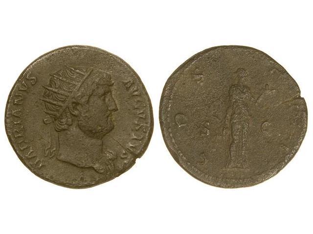 ROMAN COINS: ROMAN EMPIRE - Dupondio. Acuñada el 125-128 d.C. ADRIANO. Anv.: HADRIANUS AUGUSTUS. Cabeza radiada a derecha. Rev.: COS(III) S.C. Buena Fé, en pié a derecha. (Pequeña grieta). C-388. MBC/MBC-.