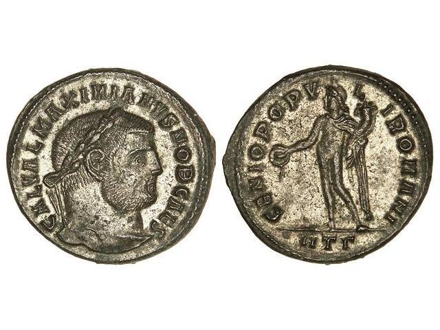 ROMAN COINS: ROMAN EMPIRE - Follis. Acuñada el 294 d.C. GALERIO MAXIMIANO. HERACLEA. Rev.: GENIO POPVLI ROMANI. Genio en pie a izquierda. En exergo: HT¶. Plateado original. C-78. EBC/EBC-.