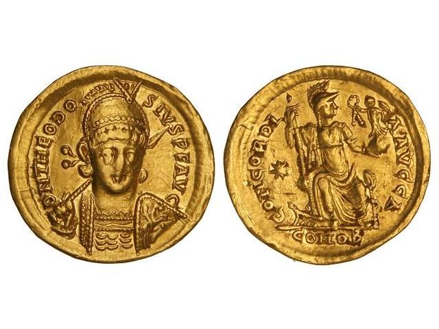 ROMAN COINS: ROMAN EMPIRE - Sólido. 408-450 d.C. TEODOSIO II. CONSTANTINOPLA. Anv.: D.N. THEODOSIVS P. F. AVG. Busto de frente, con coraza y casco, portando lanza y escudo. Rev.: CONCORDIA AVGGA. Constantinopla sentada a derecha, en campo estrella. En exe