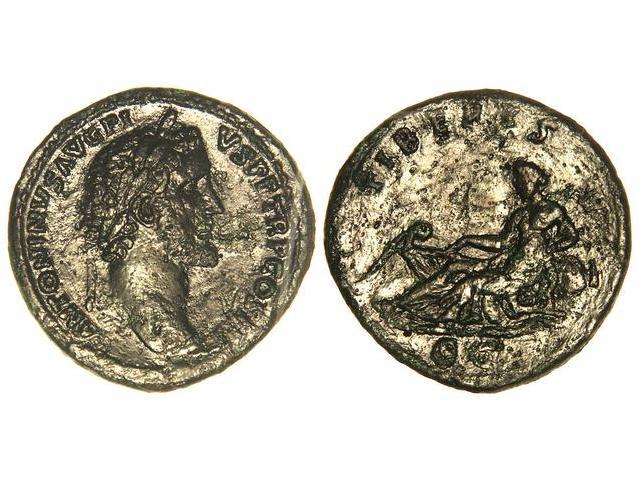 ROMAN COINS: ROMAN EMPIRE - Sestercio. Acuñada el 140-143 d.C. ANTONINO PÍO. Anv.: ANTONINVS AVG. PIVS P. P. TR. P. COS. III. Cabeza laureada a derecha. Rev.: TIBERIS S. C. El río Tíber reclinado a izquierda. Pátina oscura. C-820. MBC/MBC-.